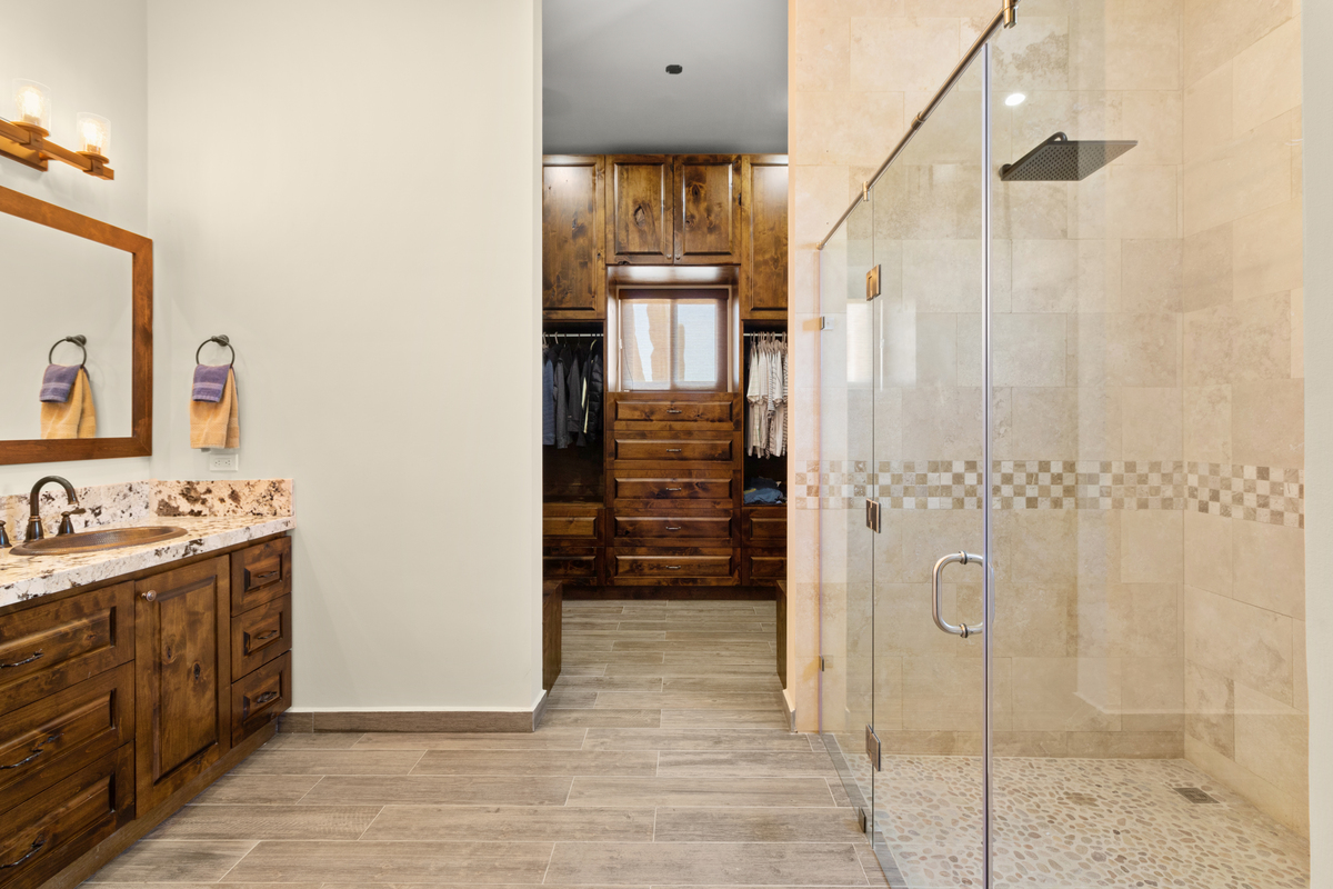 Su entrada de piedra maciza recibe a los visitantes con carácter y calidez, guiándolos hacia una amplia sala, cocina y comedor de concepto abierto, con techos de 3 metros de altura, una gran despensa empotrada y dobles puertas corredizas de vidrio que se abren al patio, llenando el espacio de luz y aire. En cada detalle se refleja la calidad: gabinetes de madera hechos a medida, azulejos de gran formato, cubiertas de granito y electrodomésticos de acero inoxidable se combinan para crear una atmósfera de elegancia y confort.